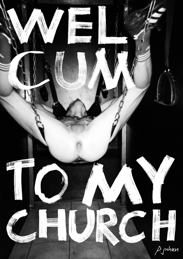 "Welcum To My Church" monochrome photographic art print by Peter Juhan from KINKS XXX VANILLAPHOBIA (2023) exhibition. Shot with disposable film camera.